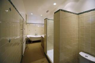 Cette chambre a la particularité de ne pas avoir de séparation avec la salle de bain. Un grand lit double est situé au milieu de la pièce sobre, 2 lits jumeaux ont été installés dans une petite tour attenante. Un WC séparé ainsi qu'une autre salle de bain avec douche sont à votre disposition.