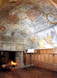 Fresques et peintures murales du XVIe siècle représentent des scènes de chasse et un décor de la Renaissance Italienne.